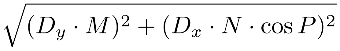D := math.Sqrt(math.Pow(dy*M, 2) + math.Pow(dx*N*math.Cos(P), 2))