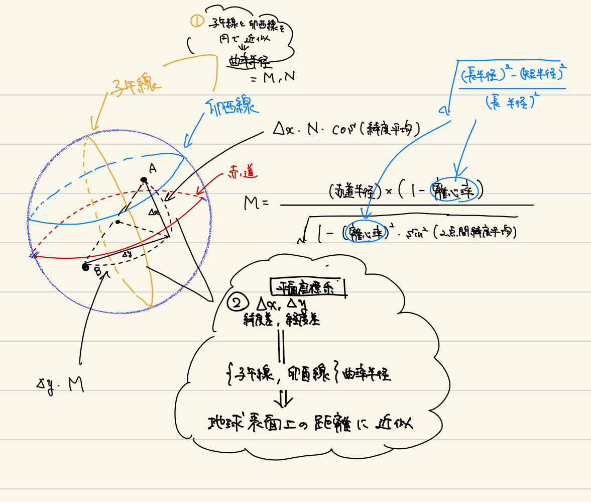 まず,子午線と卯酉線は,球面上(楕円球上)にあるため,その断面をほどんど円として近似できます.この円の半径をそれぞれ,子午線曲率半径 M,卯酉線曲率半径 N と呼びます.