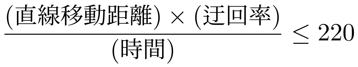 加えて,先程の距離計測は,直線距離の話です.人間が行き来するのは道路ですから,直線距離よりもロスが生じます.このロスを含んだ道路上の距離を学術的には「迂回距離」と呼ぶそうです.直線距離を 1 とした場合における迂回距離の比を示す指標を迂回率と呼びますが,田村ら(2001)の論文によれば,高速道である常磐自動車道の迂回率は東名道は 1.000, 関越道は 1.318, 東北道は 1.851 となっています.さらに,筑波研究学園都市の迂回率は 1.25 程度とされています.このように,はっきり言ってまちまちであるため,迂回率の数値はサービスなどを開始したあとに,調整していくしかないと思われます.